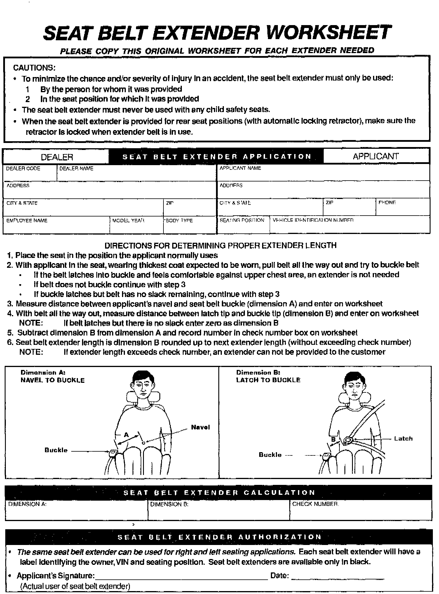 The dealership service department should complete the affixed Seat Belt Extender Label and review the "owner instruction sheet" with the customer. The dealership should give a copy of the completed worksheet to the customer and keep the original in the customer's file.