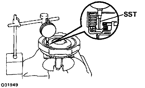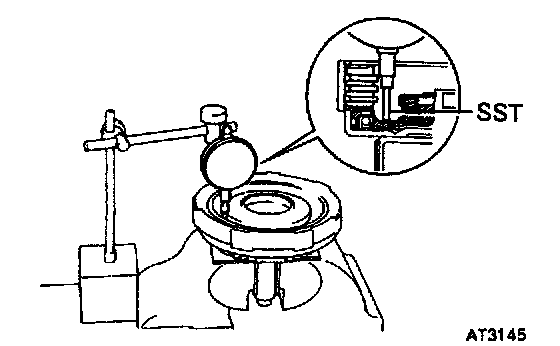 Set a dial indicator and measuring terminal (SST) together, measure the forward clutch piston stroke while applying and releasing compressed air (392 - 785 kPa, 4 - 8 kgf/cm, 57 - 114 psi).