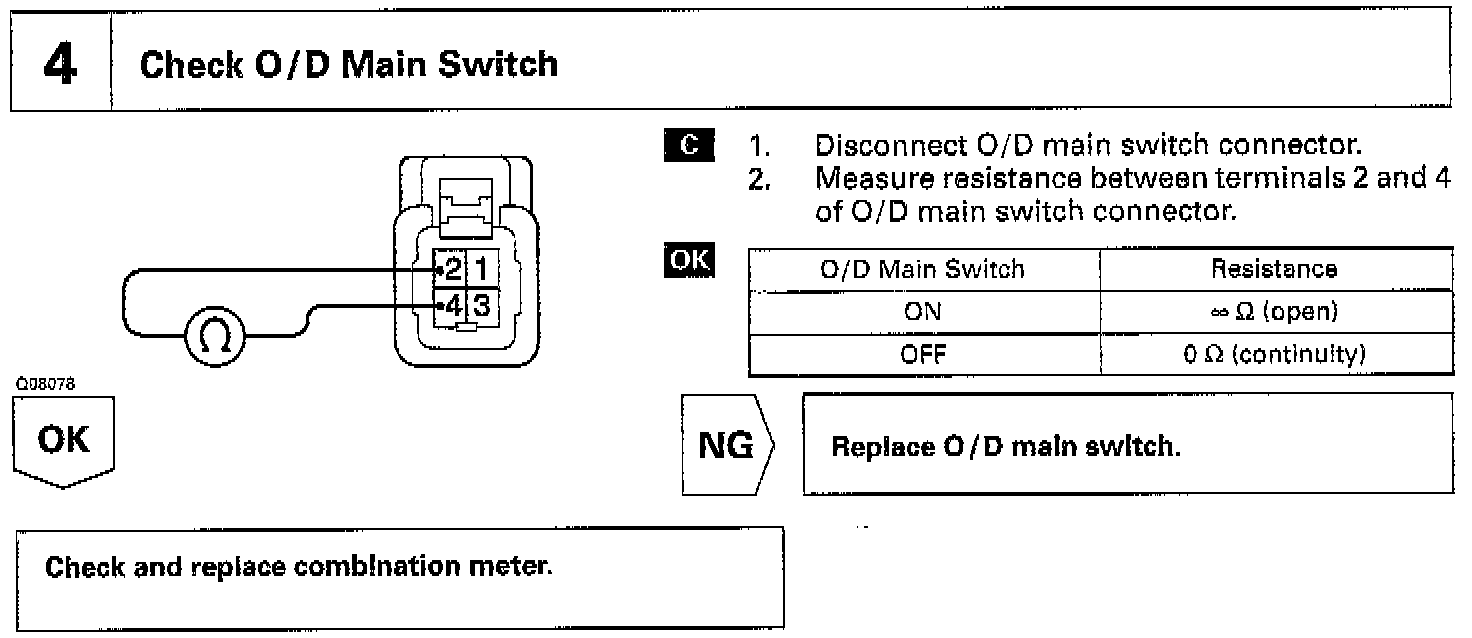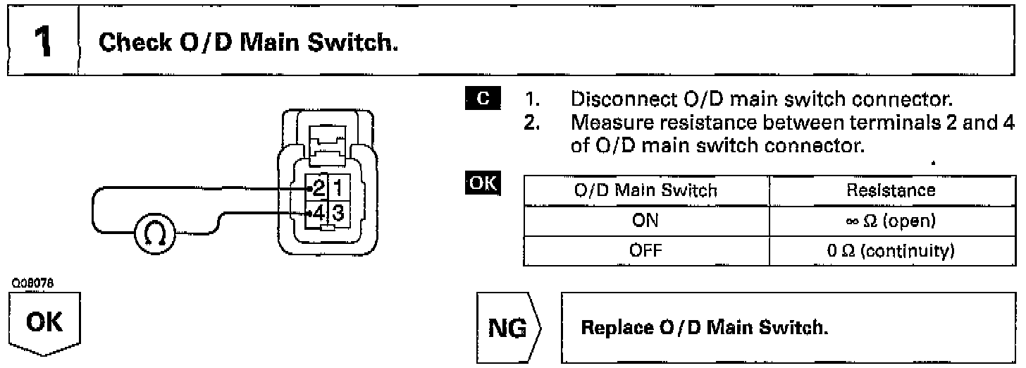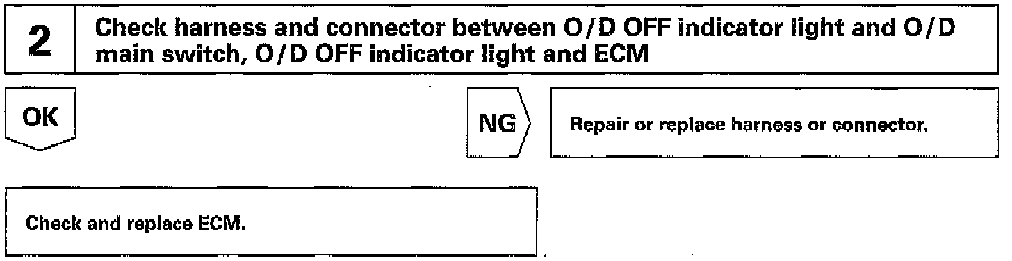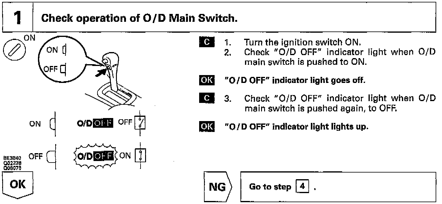 The O/D main switch contacts go open when the switch is pushed in and go closed when it is pushed once again. In O/D main switch OFF position, the O/D OFF indicator lights up, and the ECM prohibits shifting to O/D.