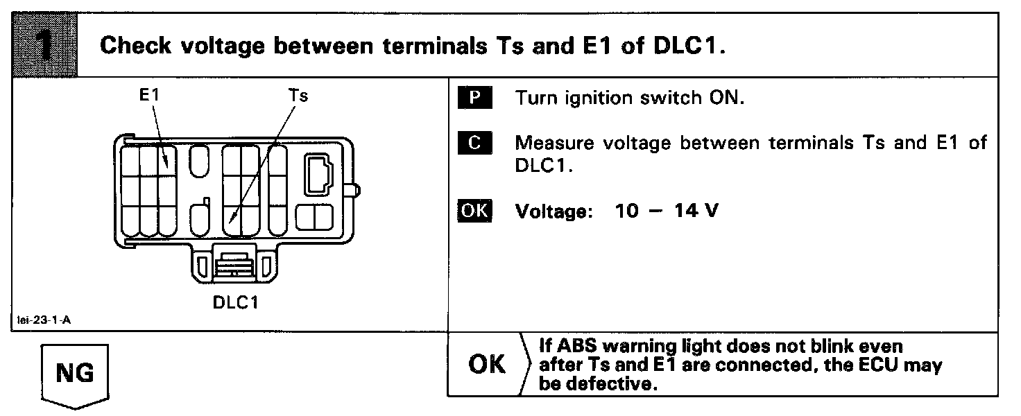 Connecting terminals Ts and E1 of the DLC1 in the engine compartment starts the check.