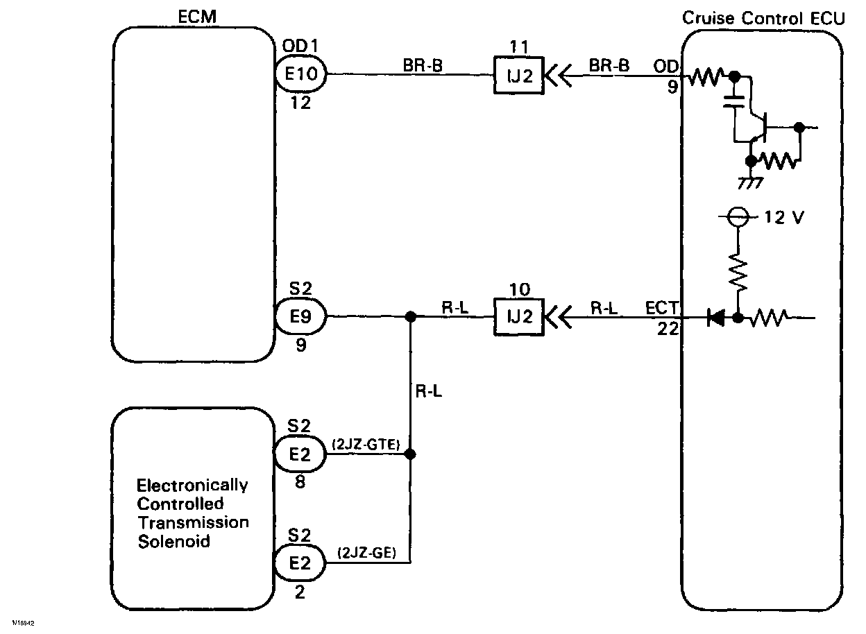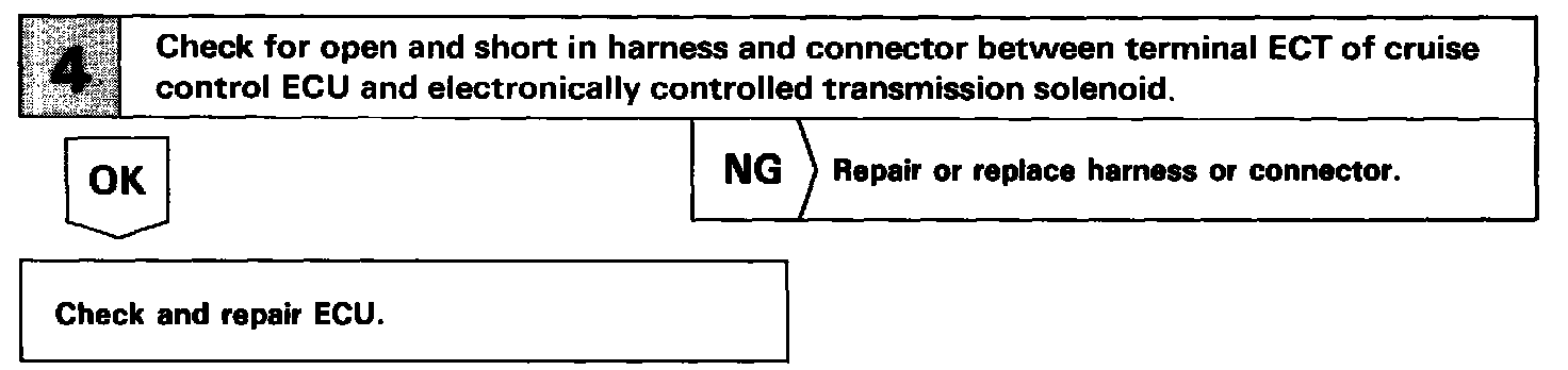 Terminal ECM of the cruise control ECU detects the shift change signal (output to electronically controlled transmission No.2 solenoid) from the electronically controlled transmission.