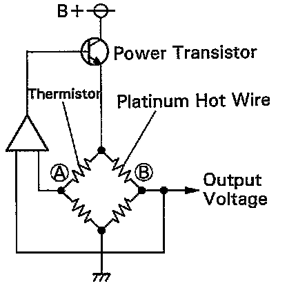 The hot wire is maintained at the set temperature by controlling the current flow through the hot wire. This current flow is then measured as the Output voltage of the air flow meter.