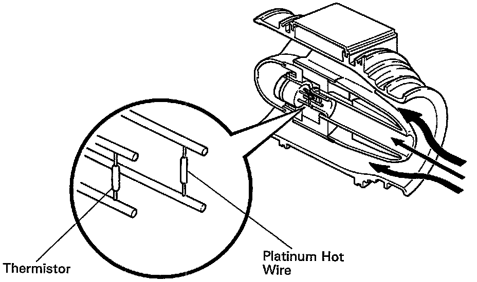 The mass air flow meter uses a platinum hot wire. The hot wire air flow meter consists of a platinum hot wire, thermistor and a control circuit installed in a plastic housing. The hot wire air flow meter works on the principle that the hot wire and thermistor located in the intake air bypass of the housing detect any changes in the intake air temperature.