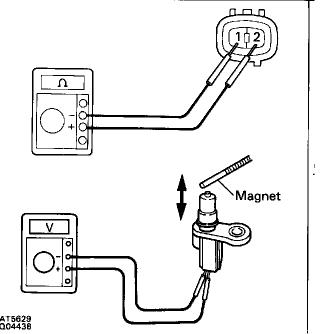 - Check voltage between terminals 1 and 2 of the NO.2 speed sensor when a magnet is put close to the front end of the NO.2 vehicle speed sensor then taken away quickly.