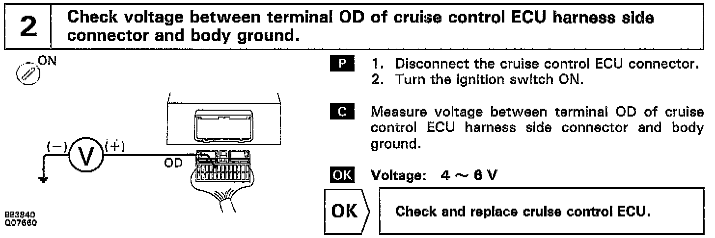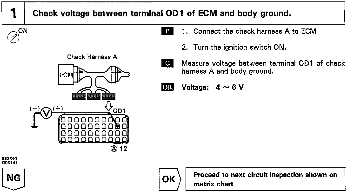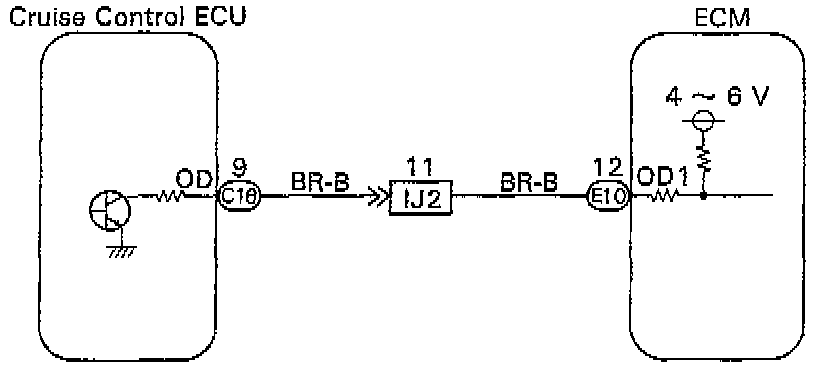 The cruise control ECU sends O/D cut signals to the ECM as necessary and the ECM cancels O/D shifting until these signals are discontinued.