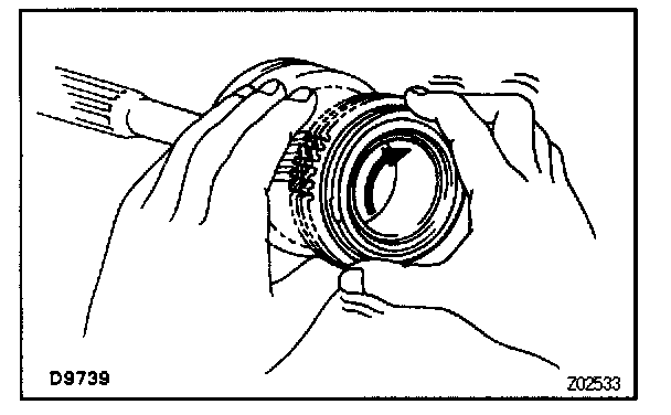 b. Check the braking effect of the synchronizer ring. Turn the synchronizer ring in one direction while pushing it to the gear cone. Check that the ring locks. If the braking effect is insufficient, apply a small amount of fine lapping compound between the synchronizer ring and gear cone. Lightly rub the synchronizer ring and gear cone together.