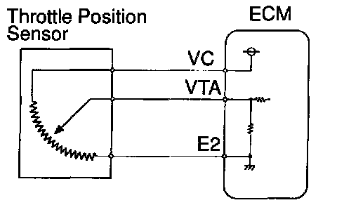 The throttle position sensor is mounted in the throttle body and detects the throttle valve opening angle. When the throttle valve is fully closed, a voltage of approximately 0.7 V is applied to terminal VTA of the ECM. The voltage applied to the terminals VTA of the ECM increases in proportion to the opening angle of the throttle valve and becomes approximately 2.7 - 5.2 V when the throttle valve is fully opened. the ECM judges the vehicle driving conditions from these signals input from terminals VTA and uses them as one of the conditions for deciding the air-fuel ratio correction, power increase correction and fuel-cut control etc.