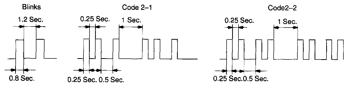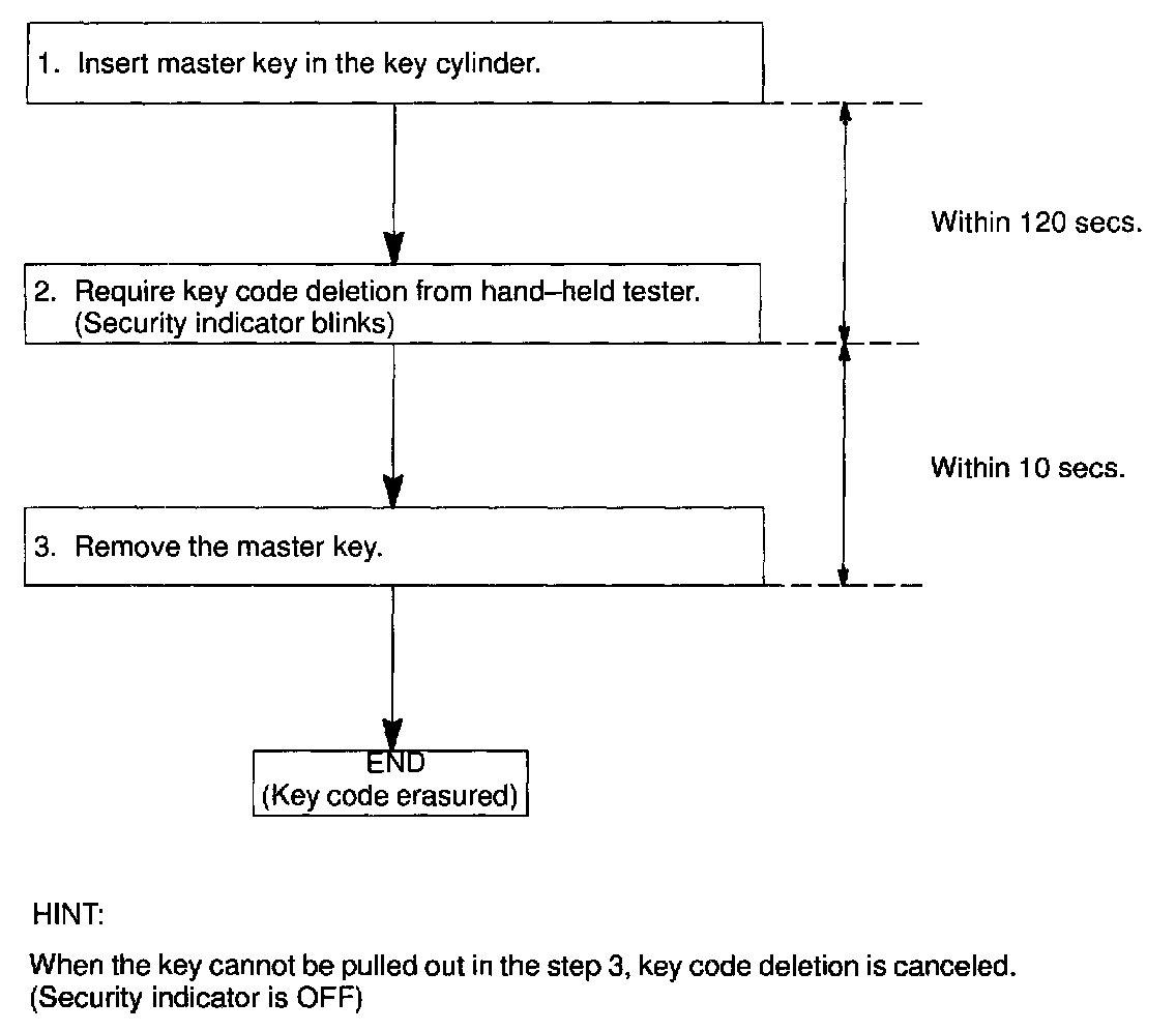 - When key code registration could not be performed in the automatic registration mode, code 2-1 is output from the security indicator and when inserting the already registered key, code 2-2 is output.