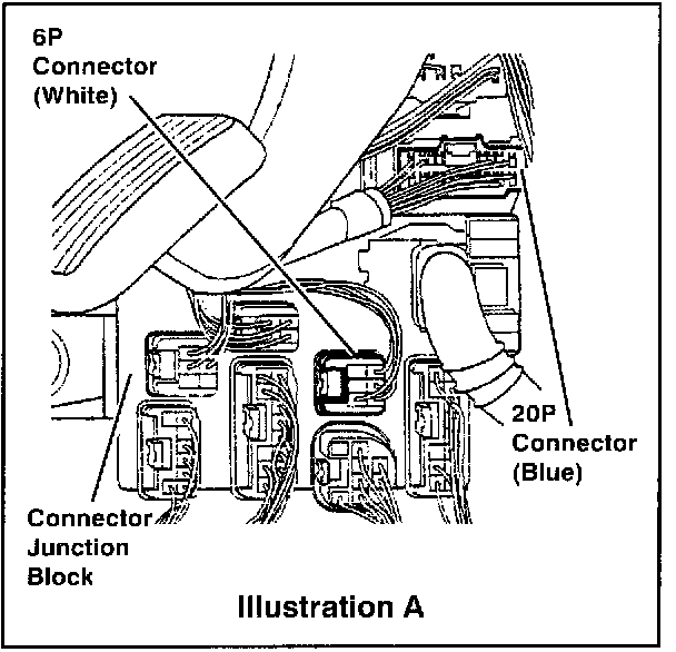 4. Locate the Connector Junction Block in the driver's cowl area. You will notice a RED/WHITE wire routed to the White 6P connector which terminates at an adjacent splicing connector. This is the TVIP Door Courtesy Wire. You will also notice a GREEN wire routed to the Blue 20P connector located right above the Connector Junction Block. This is the TVIP Trunk Courtesy Wire.