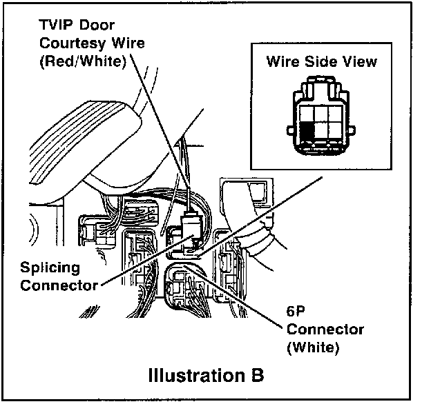 ^ A splicing connector is used for the new door courtesy (red/white) wire installation to the vehicle's wire harness at the Driver Side J/B (white 6P connector).