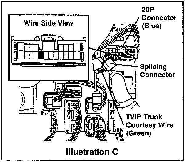 ^ A splicing connector is used for the new trunk courtesy (green) wire installation to the vehicle's wire harness at the Connector J/B (blue 20P connector).
