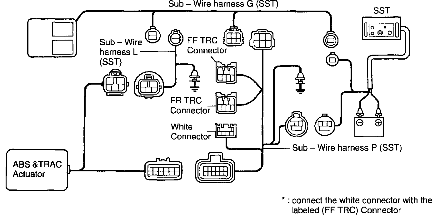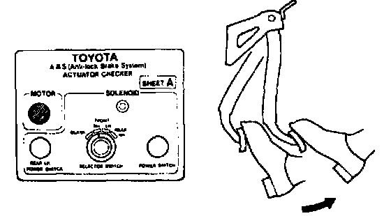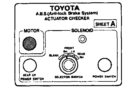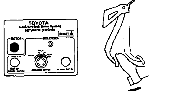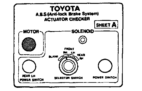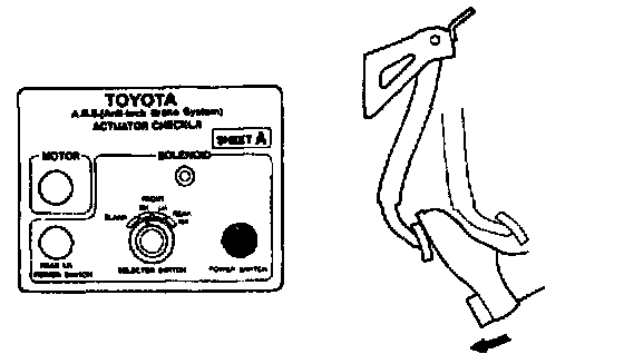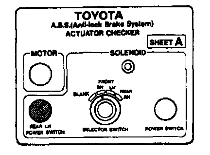 ABS & TRAC ACTUATOR ON-VEHICLE INSPECTIONHINT: Using the Anti-lock Brake System (ABS) actuator checker (Special Service Tools) (SST), check the operation of the actuator. If the actuator does not operate, check the operation of sub-wire harness G. If the solenoid and/or pump motor relay are abnormal, replace the relay and inspect the actuator operation again.