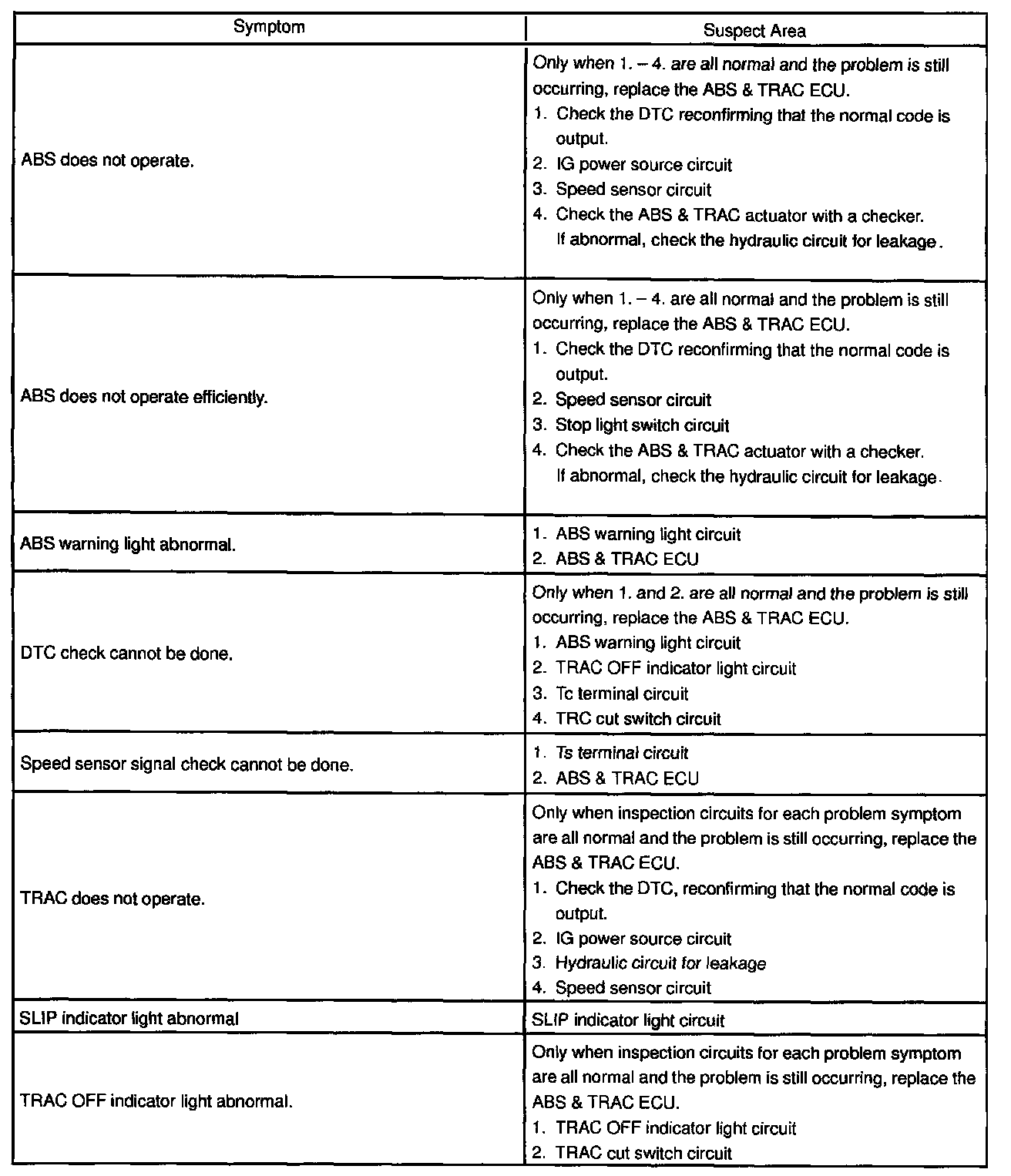 If a normal code is displayed during the DTC check but the problem still occurs, check the circuits for each problem symptom in the order given in the table and proceed to the relevant troubleshooting.