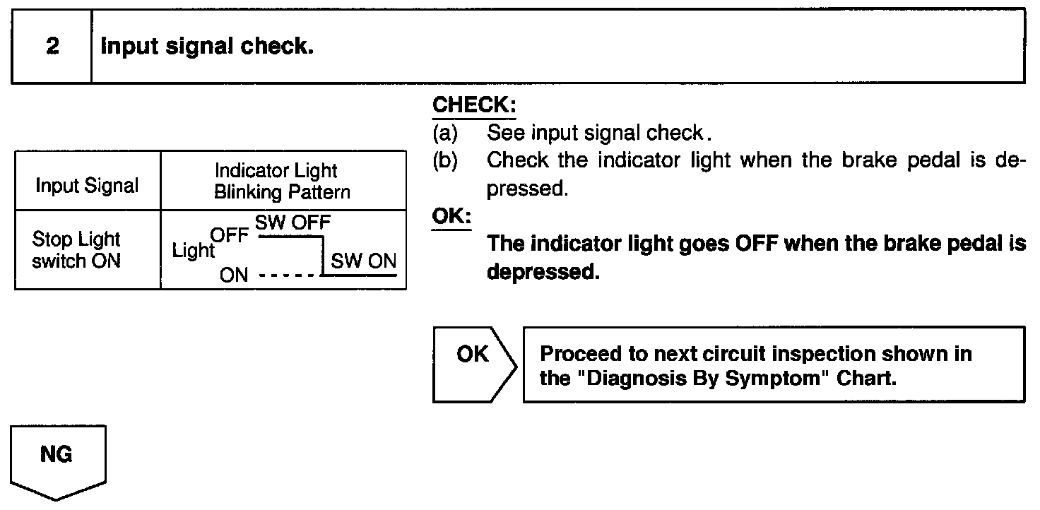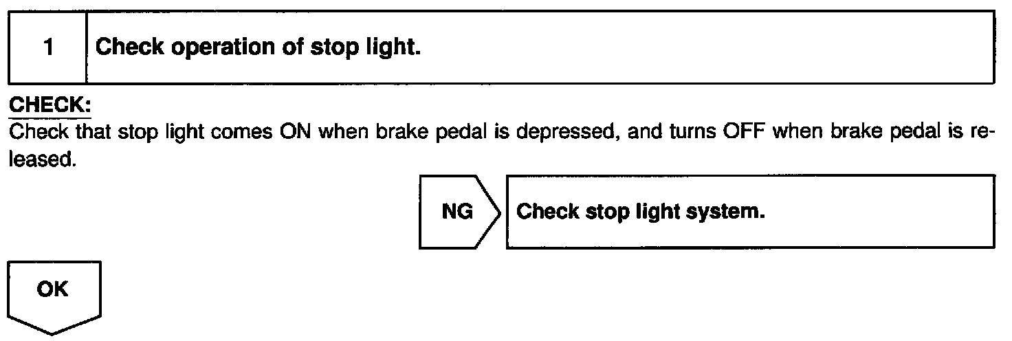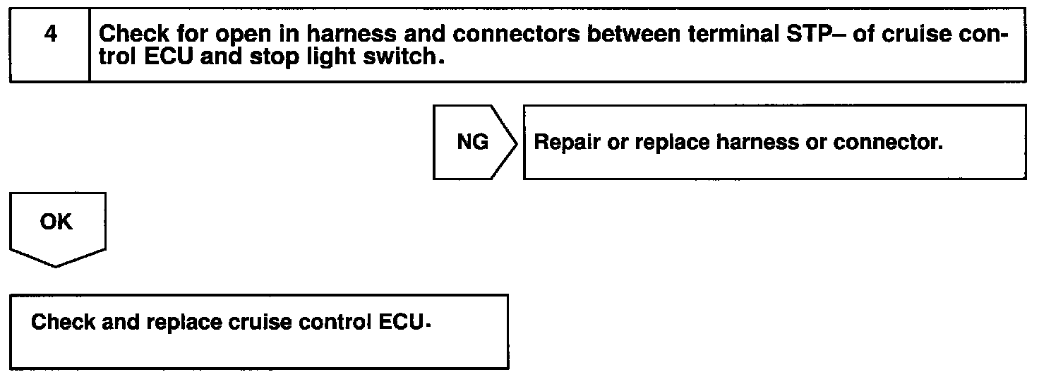 When the brake is ON, battery positive voltage normally is applied through the STOP fuse and stop light switch to terminal STP- of the ECU, and the ECU turns the cruise control OFF.
