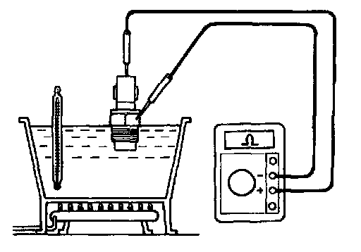 a. Using an ohmmeter, check that there is no continuity between the terminals when the coolant temperature is above 98 °C (208 °F).
