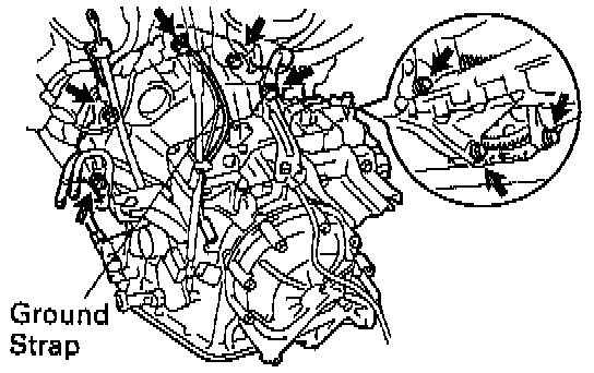 Remove the 3 bolts, ground strap and Right-Hand engine mounting stay.