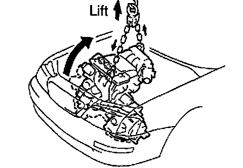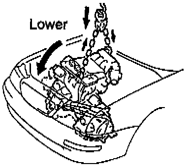 b. Lower the engine into the engine compartment. Tilt the transaxle downward, lower the engine and clear the Left-Hand mounting.