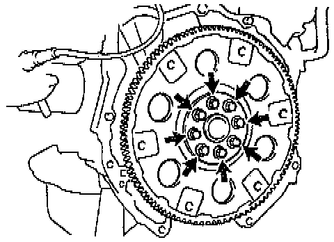 2) Hold the crankshaft pulley bolt with a wrench, and install the 6 bolts evenly.