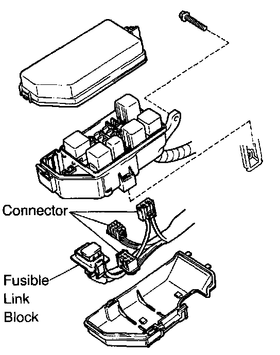 c. Disconnect the 3 connectors and fusible link block from the relay box.