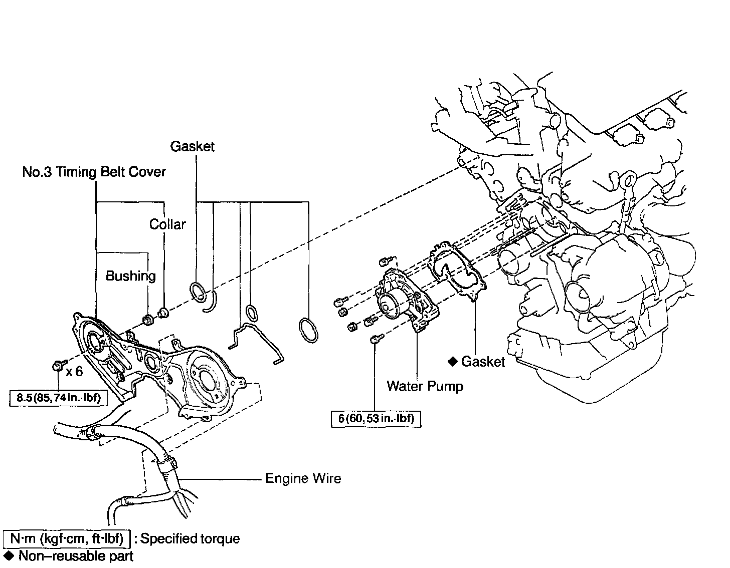 Install a new gasket and the water pump with the 4 bolts and 2 nuts.