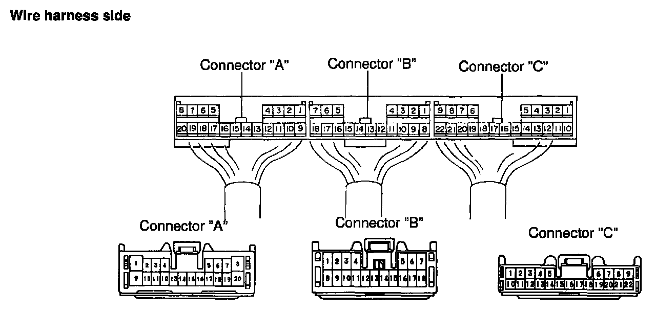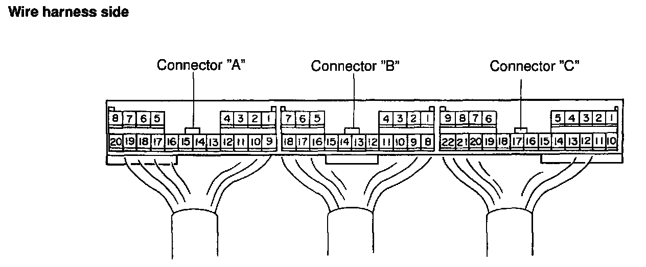c. Connect the connectors to the amplifier and inspect the wire harness side connector from the back side, as shown in the chart.