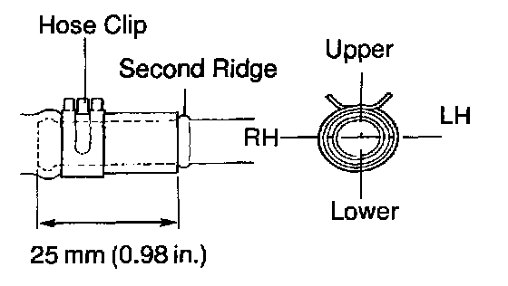 Push the water hose onto the heater radiator pipe as far as second ridge on the pipe and install the hose clip.
