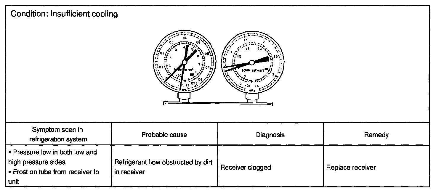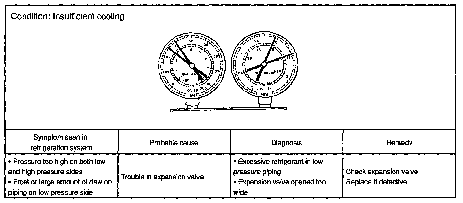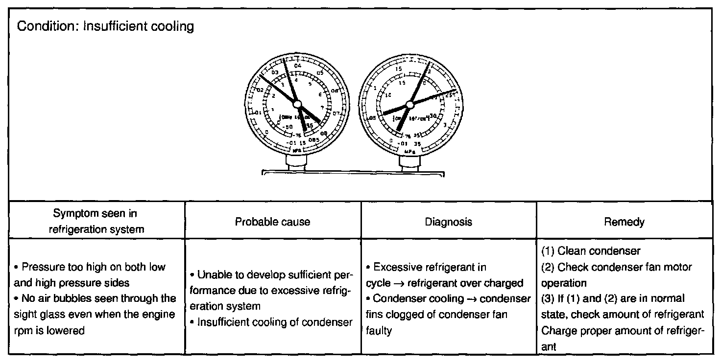 This is a method in which the trouble is located by using a manifold gauge set. Read the manifold gauge pressure when the these conditions are established.