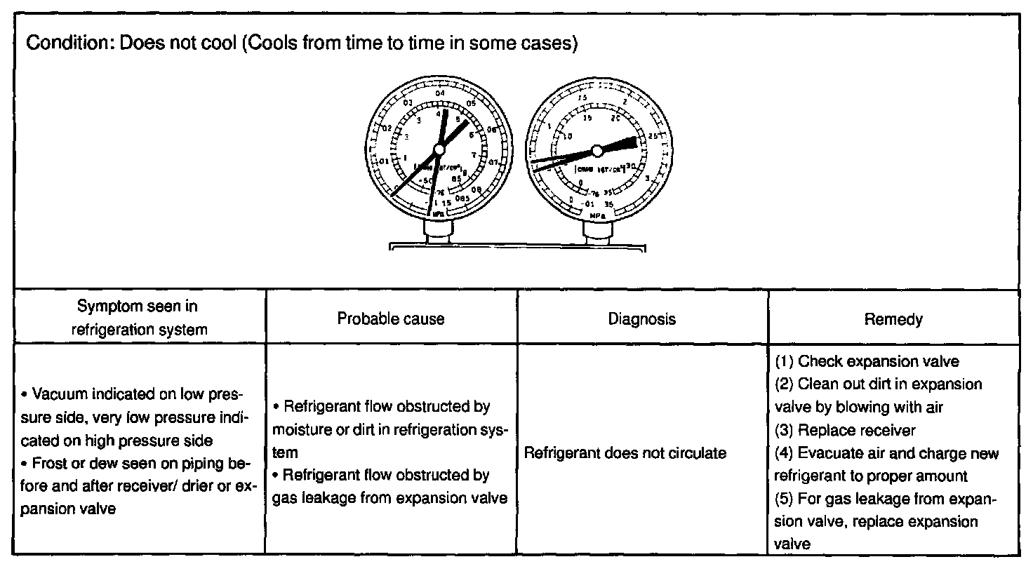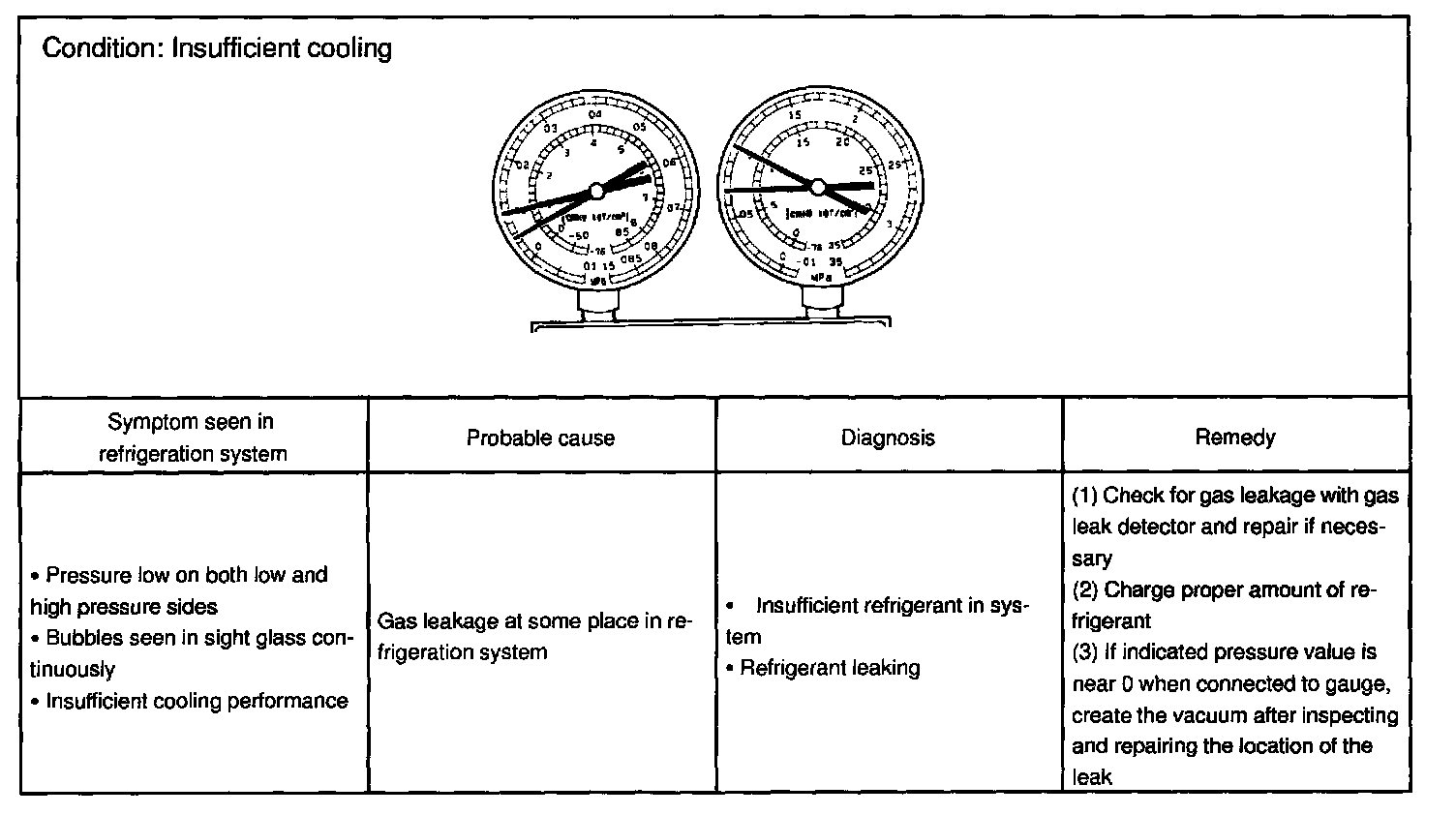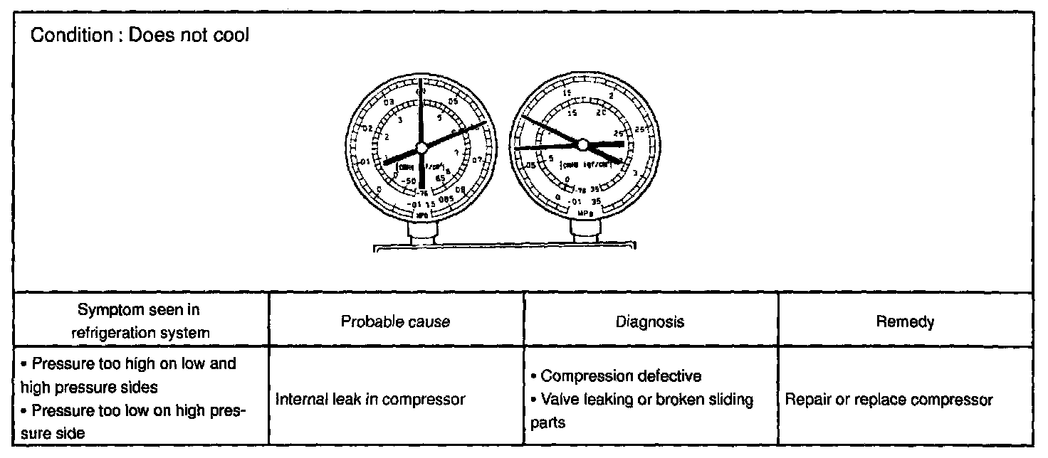 This is a method in which the trouble is located by using a manifold gauge set. Read the manifold gauge pressure when the these conditions are established.