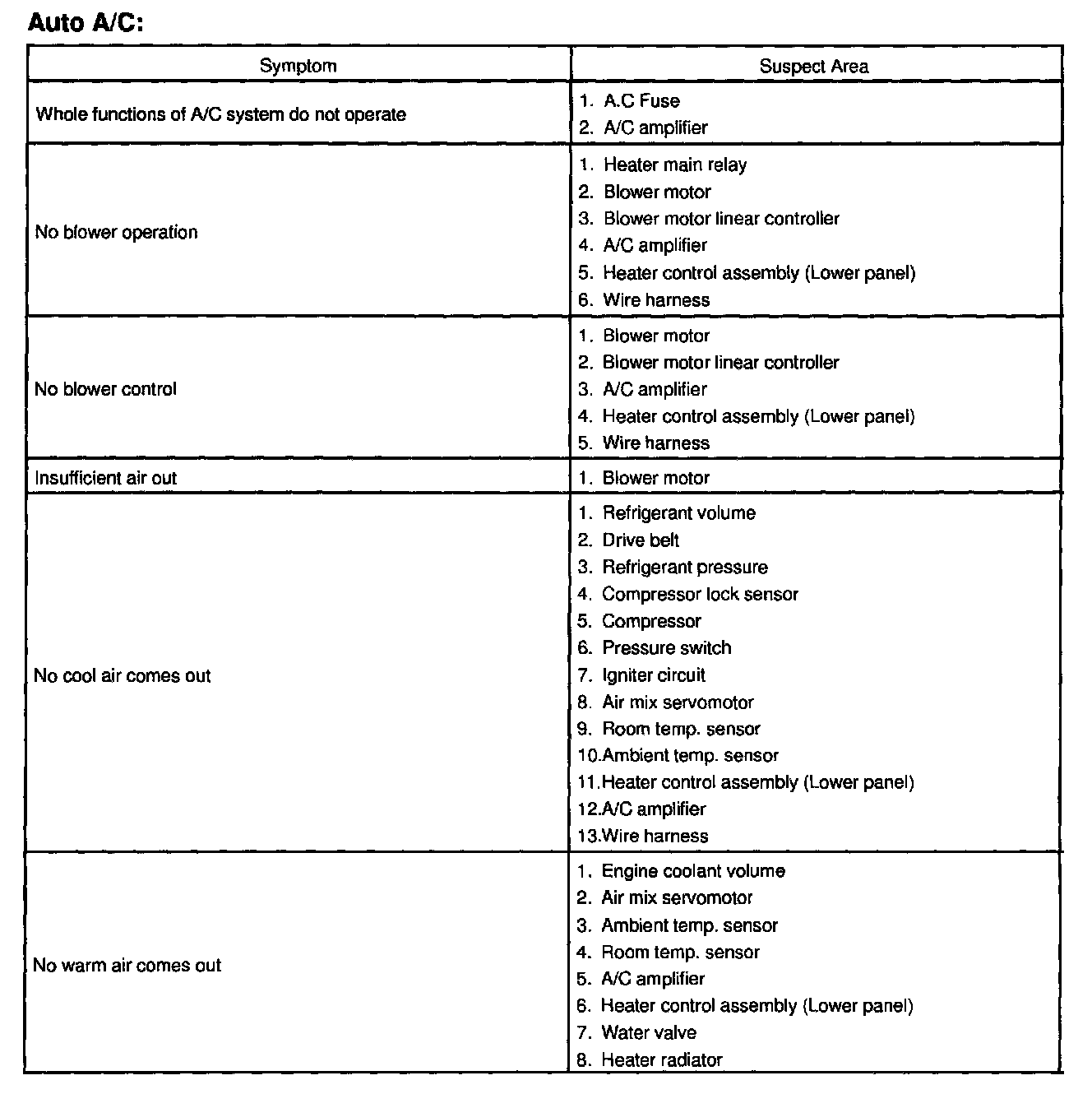 PROBLEM SYMPTOMS TABLEUse the table to help you find the cause of the problem. The numbers indicate the priority of the likely cause of the problem. Check each part in order, if necessary replace these parts.