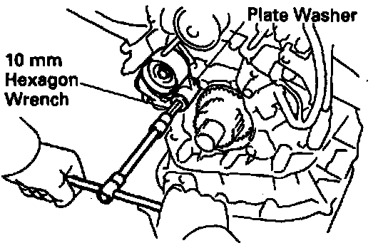 a. Using a 10 mm hexagon wrench, install the plate washer and idler pulley with the pivot bolt.
