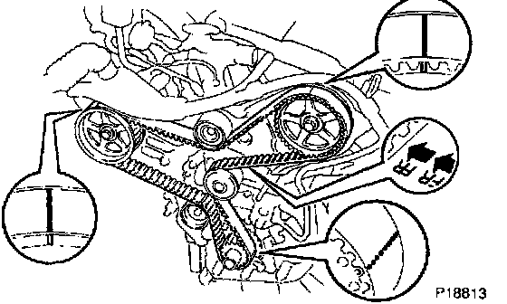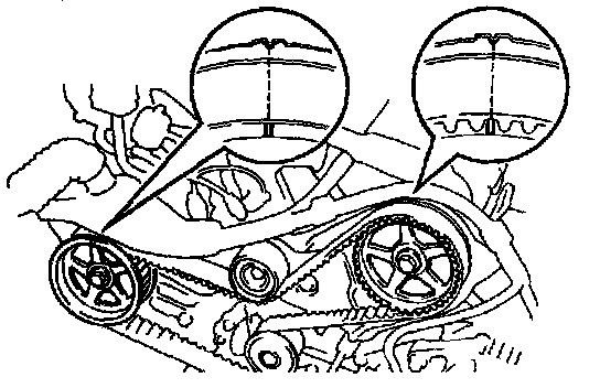 If the installation and front marks have disappeared, before removing the timing belt, place 3 new installation marks on the timing belt to match the timing marks of the timing pulleys, and place a new front mark on the timing belt.