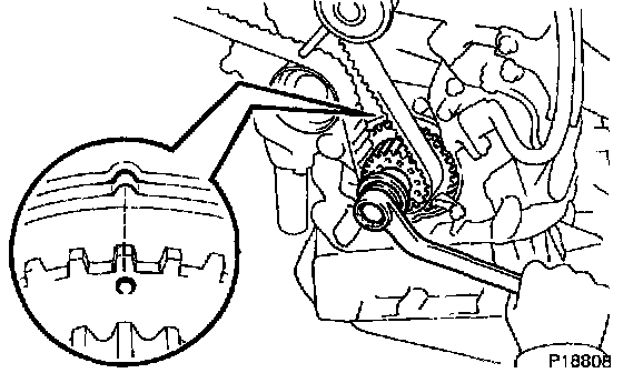 b. Turn the crankshaft, and align the timing marks of the crankshaft timing pulley and oil pump body.