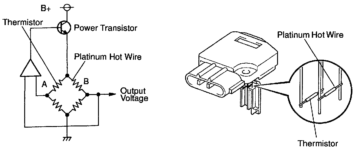 The mass air flow meter uses a platinum hot wire. The hot wire air flow meter consists of a platinum hot wire, thermistor and a control circuit installed in a plastic housing. The hot wire air flow meter works on the principle that the hot wire and thermistor located in the intake air bypass of the housing detect any changes in the intake air temperature.