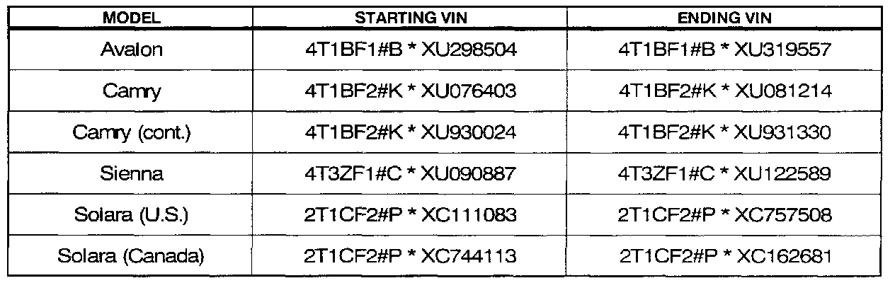 ^ 1999 TMMK produced Avalon, Camry (1MZ-FE), Sienna & TMMC produced Solara (1MZ-FE) vehicles built between the VIN numbers listed below.