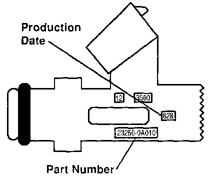 1. Remove all six fuel injectors for verification of production information. Affected injectors wilt be labeled with a vendor part number of "23250-0A010" and have a production date code number of "828" or lower (see illustration for number locations).