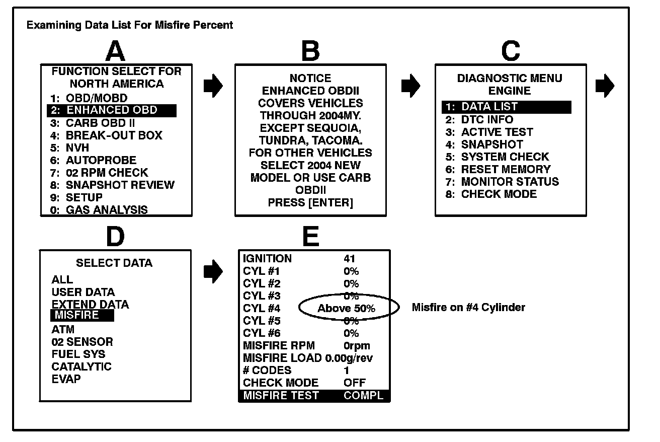 2. Confirm if misfire is currently occurring on cylinder(s) identified by DTC(s) using the Diagnostic Tester while engine is idling (see below).
