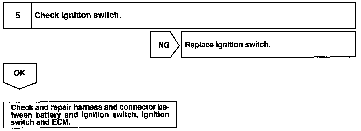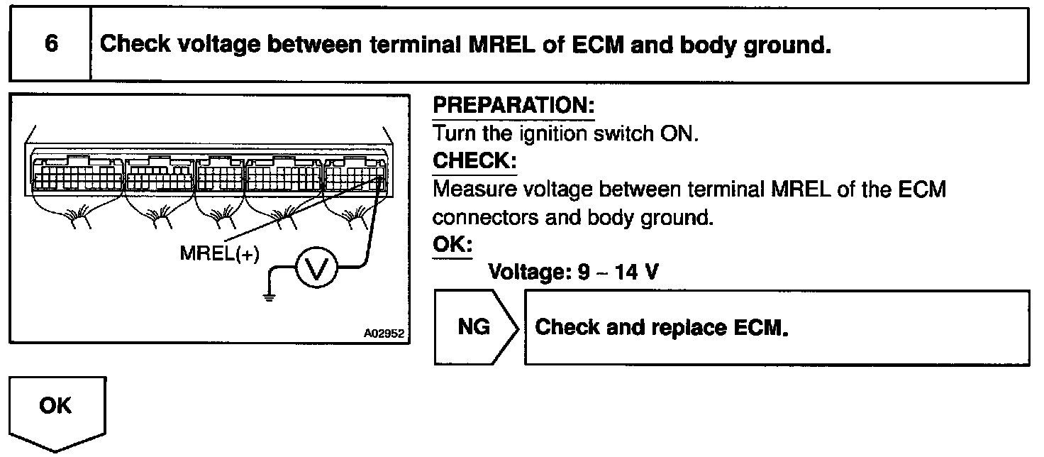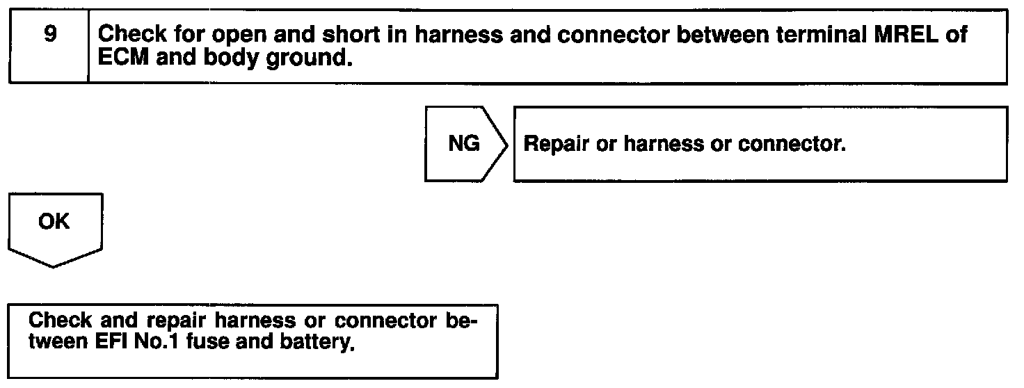 CIRCUIT DESCRIPTIONWhen the ignition switch is turned ON, battery positive voltage is applied to terminal IGSW of the ECM and the EFI main relay (Marking; EFI) control circuit in the ECM sends a signal to terminal MREL of the ECM switching on the EFI main relay.