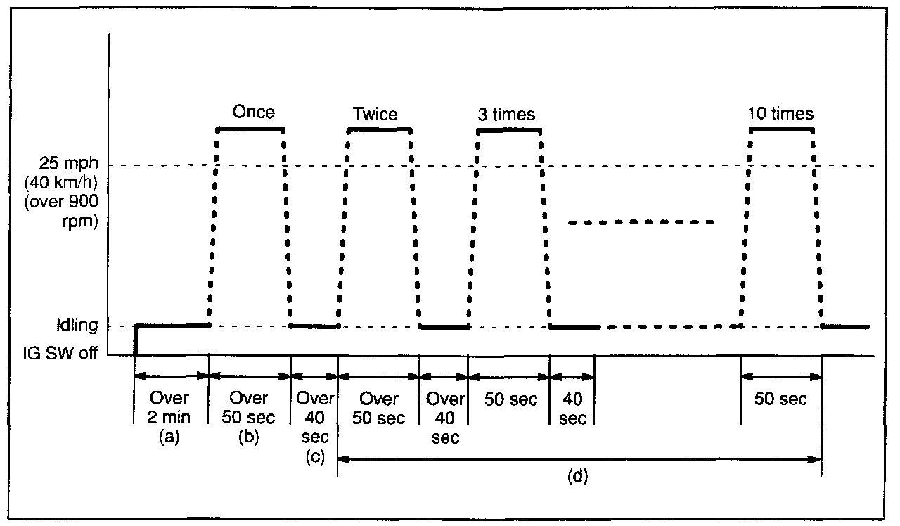 b. Drive the vehicle at 25 mph (40 km/h) or more for at least 50 seconds. Be sure engine speed remains above 900 rpm.