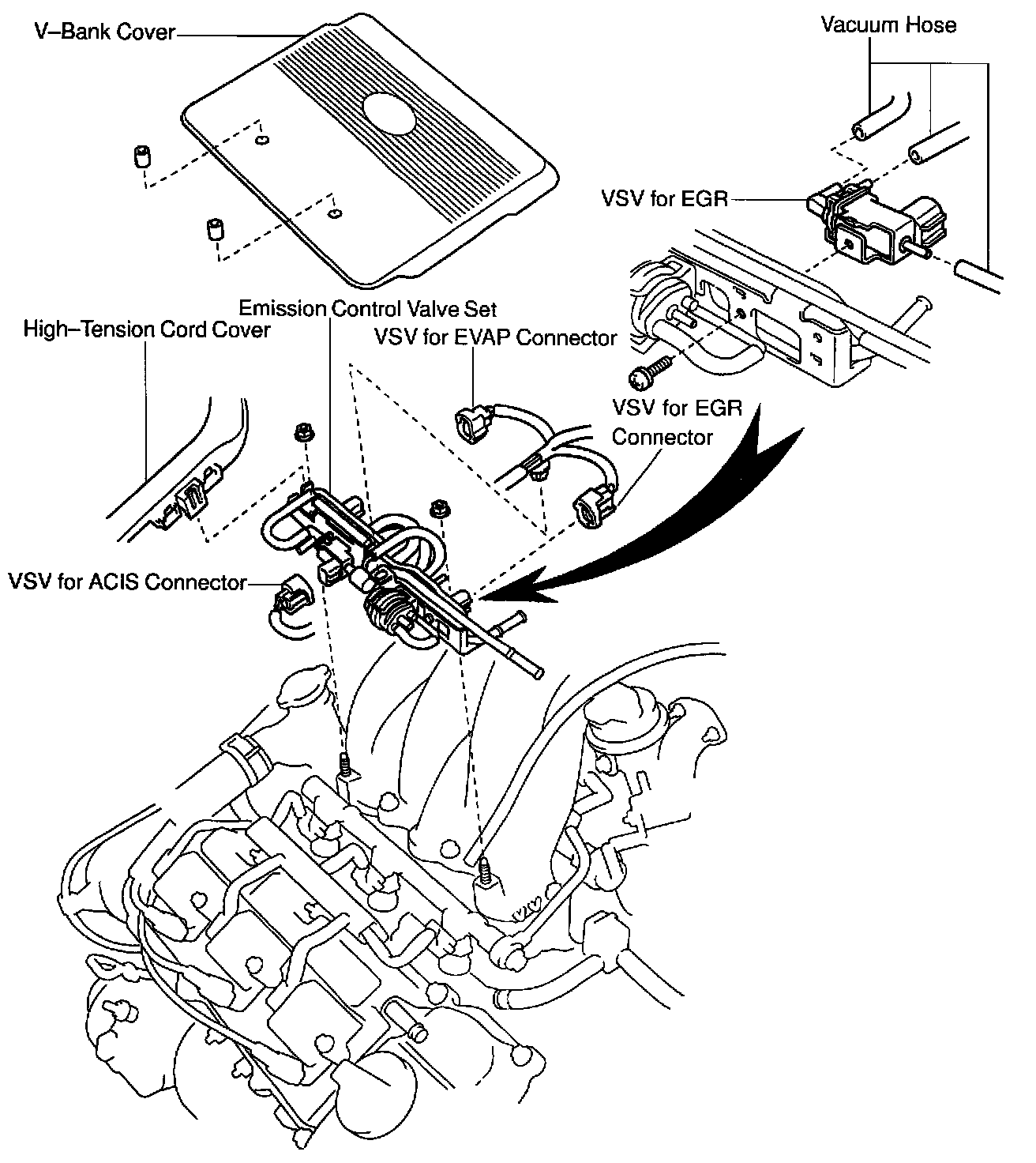 1. REMOVE V-BANK COVER AND EMISSION CONTROL VALVE SET AND HIGH-TENSION CORD COVER