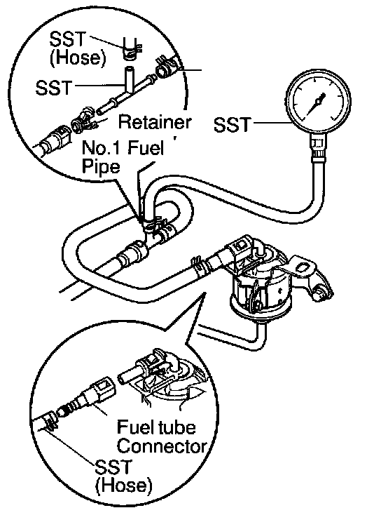 f. Install SST (pressure gauge) as shown in the illustration by using SST and fuel tube connector.