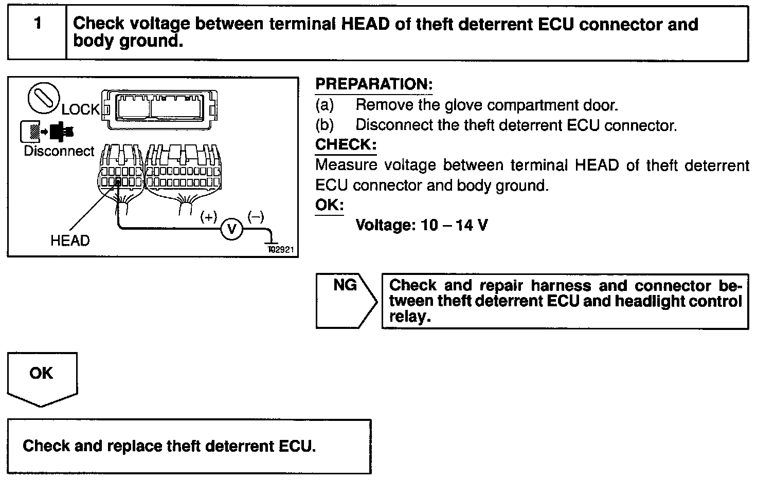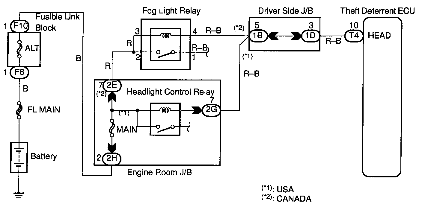 CIRCUIT DESCRIPTIONWhen the theft deterrent system is activated, it causes the Tr in the ECU to switch ON and OFF at approximately 0.4 sec. intervals. This switches the headlight control relay ON and OFF, thus flashing the headlights (See the wiring diagram).