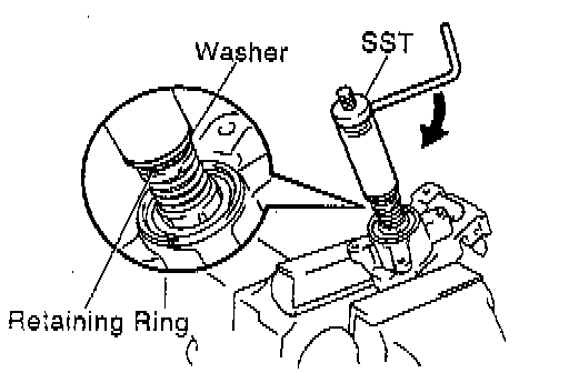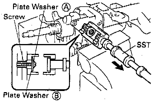 a. Set Special Service Tool (SST), plate washer (18 and 36 mm outer diameter) and screw (4.0 mm diameter, 0.7 mm pitch, 15.0 mm length), as shown in the illustration. And then remove the 2 pivot pins.