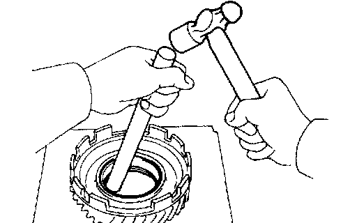 11. REMOVE OUTER RACES FROM COUNTER DRIVE GEARa. Drive out the 2 races with a brass bar and hammer.