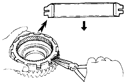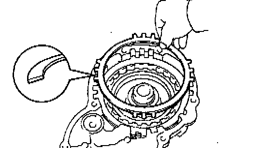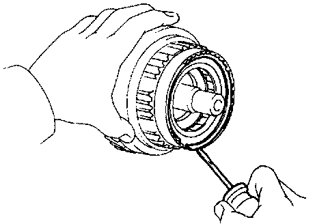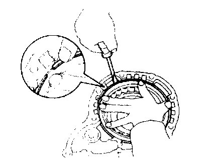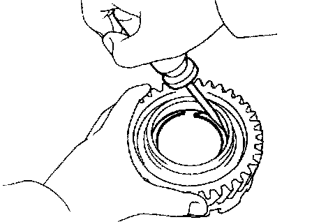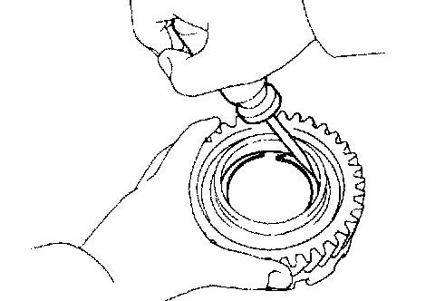 b. While pushing down the ring gear, squeeze the snap ring end with needle-nose pliers, and install it into the groove.
