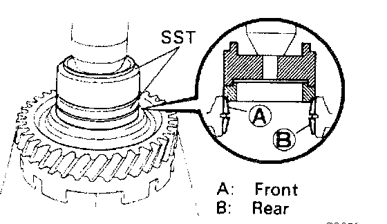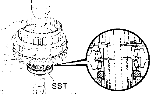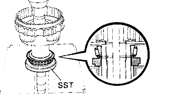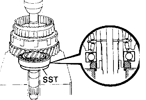 Using Special Service Tool (SST), press in the 2 outer races to both sides of the gear.