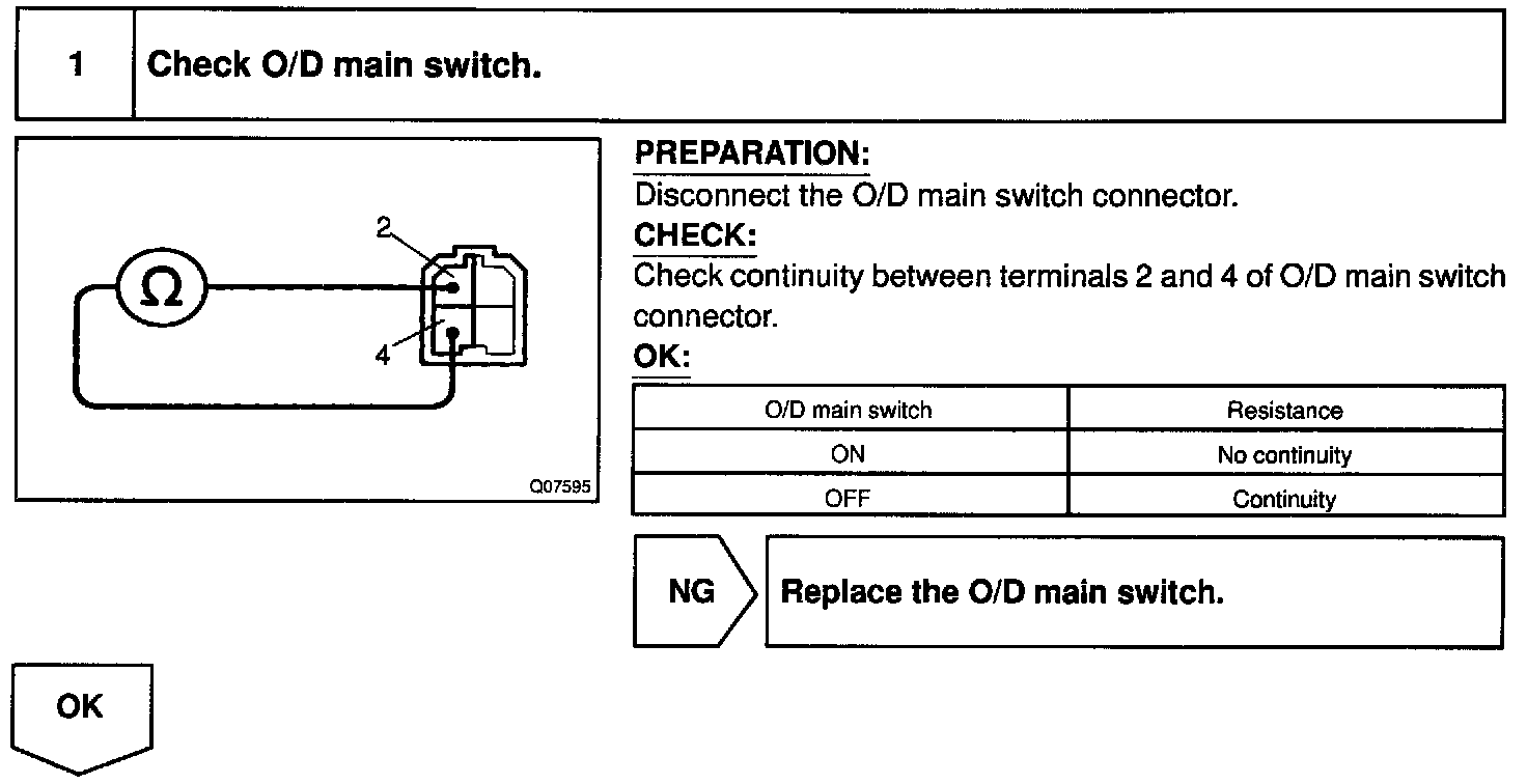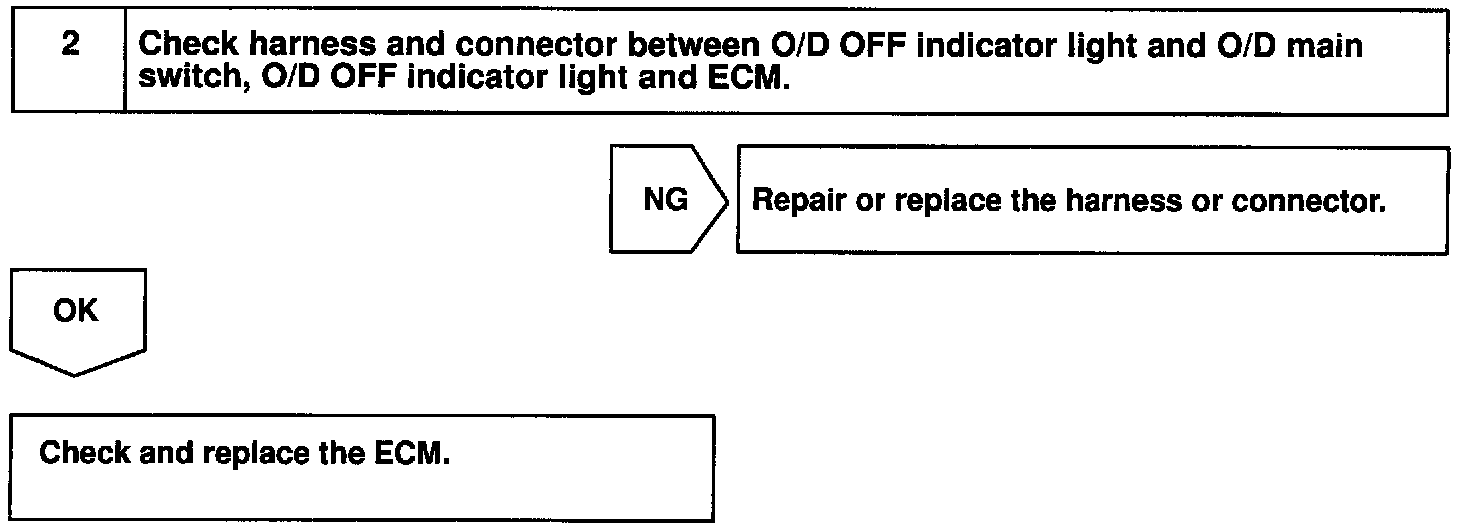 CIRCUIT DESCRIPTIONThe O/D main switch contacts go open when the switch is pushed in and go closed when it is pushed out. In O/D main switch at OFF position, the O/D OFF indicator light lights up, and the ECM prohibits shifting overdrive.