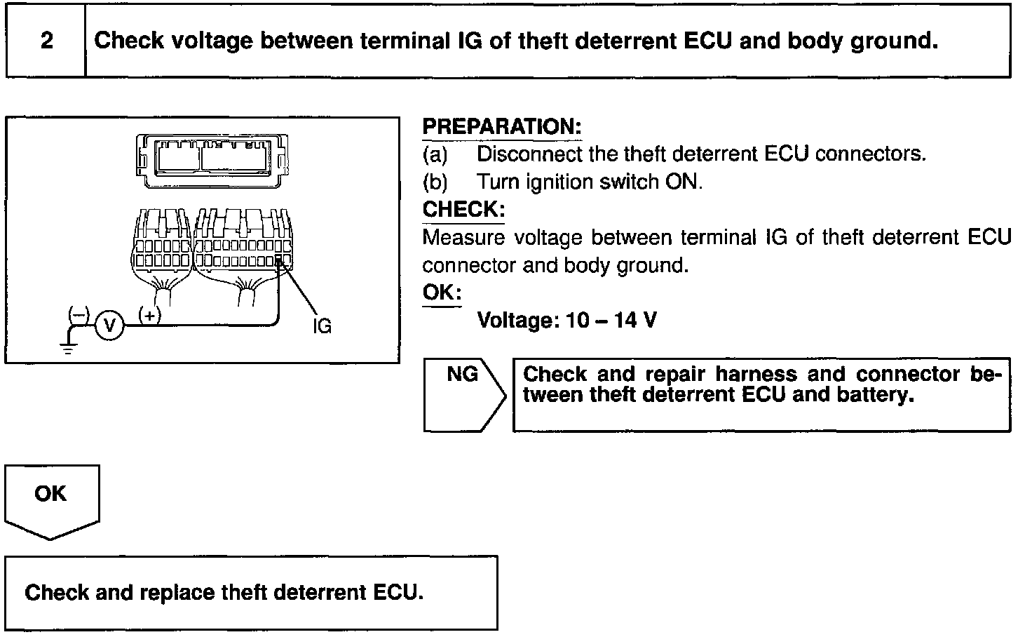 When the ignition switch is turned to the ACC position, battery positive voltage is applied to the terminal ACC of the ECU. Also, if the ignition switch is turned to the ON position, battery positive voltage is applied to the terminals ACC and IG of the ECU. When the battery positive voltage is applied to the terminal ACC of the ECU while the theft deterrent system is activated, the warning stops. Furthermore, power supplied from the terminals ACC and IG of the ECU is used as power for the door courtesy switch, and position switch, etc.