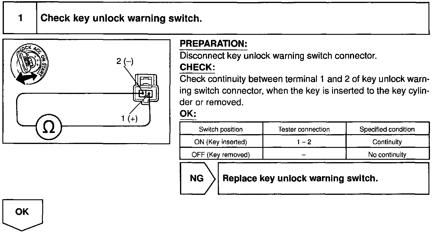 The key unlock warning switch goes ON when the ignition key is inserted in the key cylinder and goes OFF when the ignition key is removed.