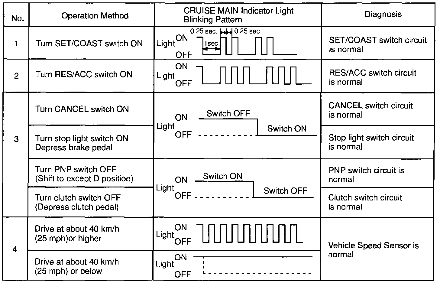 f. Read the blinking pattern of the CRUISE MAIN indicator light.