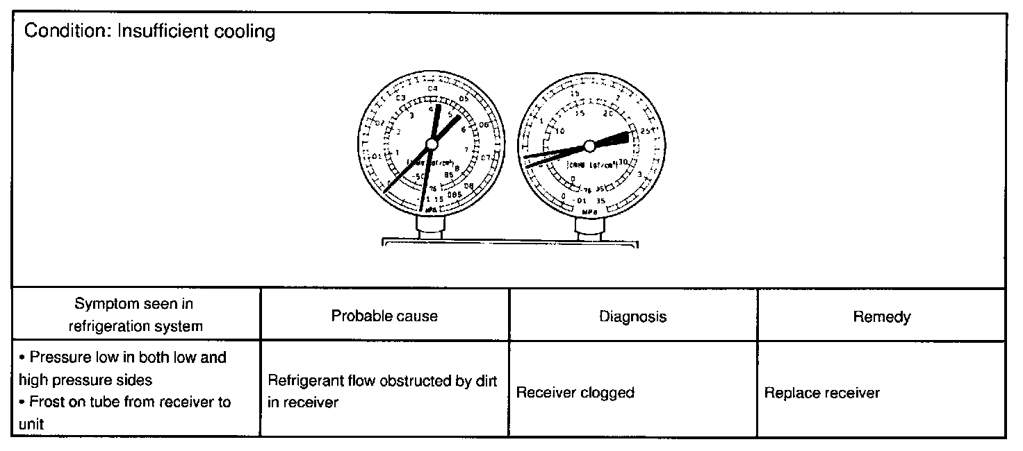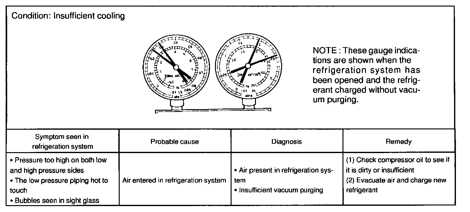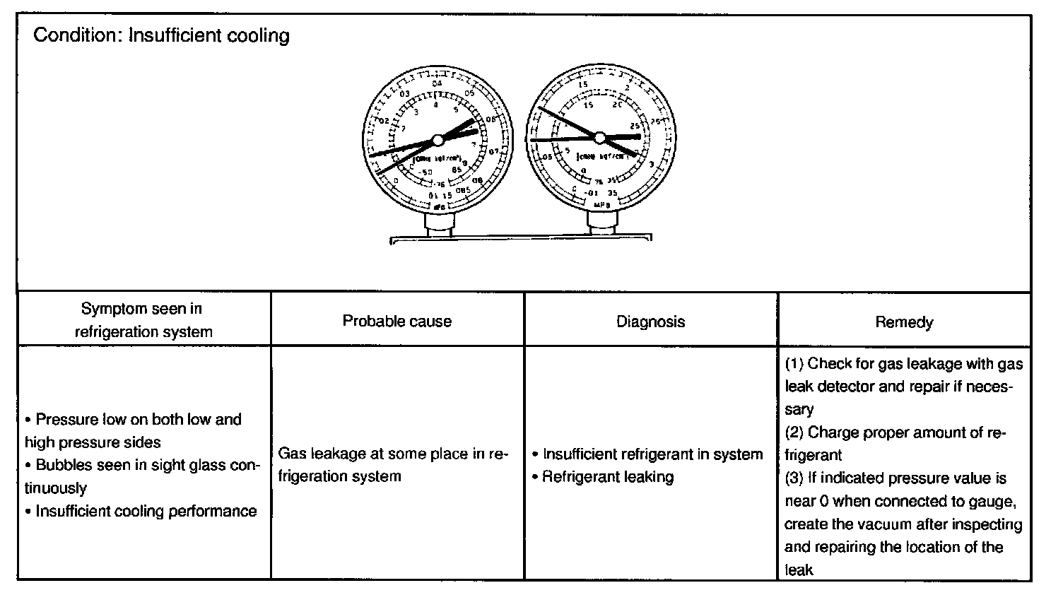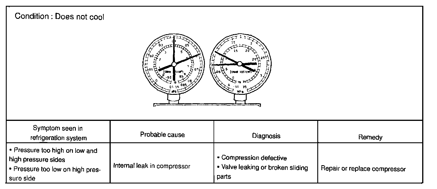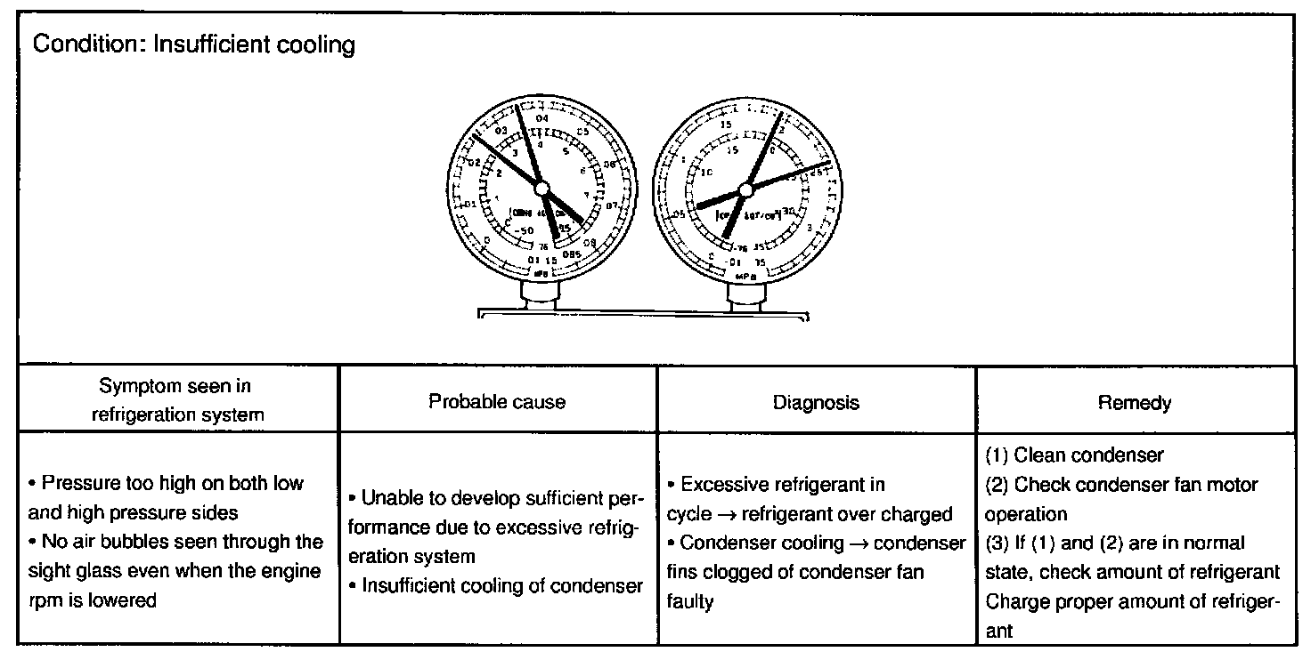 This is a method in which the trouble is located by using a manifold gauge set. Read the manifold gauge pressure when these conditions are established.